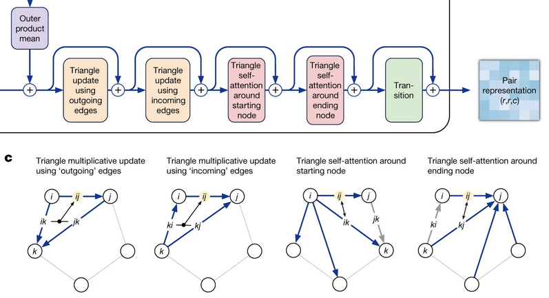 Transformerに分子進化の情報を組み込んだEvoformerという手法に特徴がある。以下の図はEvoformerの中核部分である。ペア表現から重要部分を取り出したグラフ構造に対し、三角形の部分で更新計算を行っている。三角形の乗算計算を2回、self-attentionを2回行ってる。