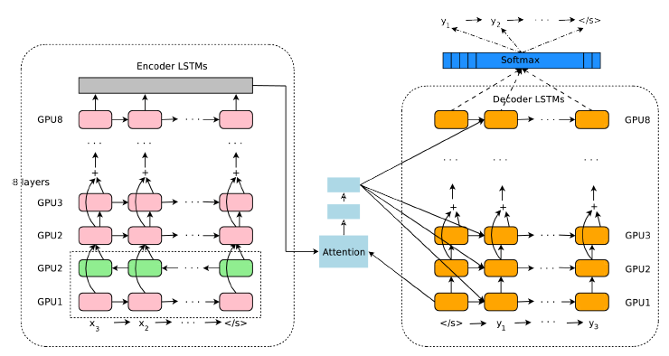 2016年のGoogle翻訳に実装されたモデルで、それ以前の機械翻訳から格段に進歩した。RNN(LSTM)とAttentionを併用し、GPUなど様々な技術を集約して実現している。ここでのAttentionはAdditive Attention [2014]と呼ばれるもので、Attentionの重みを簡単なFFNで計算する。この方法だとFFNで計算するデータ量が多いという問題がある。
