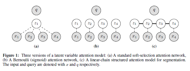 ((b))以降はSoft Attention以外の依存関係を示す。((b))は $z$ が $x$ に対応するベクトルで、ランダムに 0 or 1 の値を持つ場合である。この場合の確率はベルヌーイ分布になる。((c))は $z$ のベクトルが線形の関係を持つ場合である。